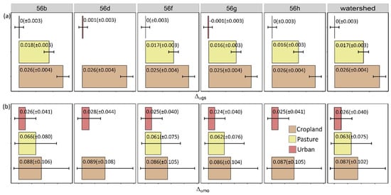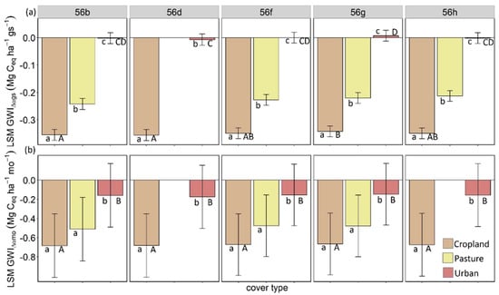 A post-hoc Tukey test analysis (Figure 5a,b) showed that, within each ecoregion, the least square means (LSMs) of GWIΔαgs had low variability and were significantly different among the cover types (Figure 5a). The LSMs for GWIΔαmo were more variable, and many cover types had statistically similar means (Figure 5b). Among ecoregions, the LSMs of cropland GWIΔαgs at Ecoregion 56g were significantly different from those at Ecoregions 56b and 56d, while the LSMs at urban GWIΔαgs at Ecoregion 56g were significantly different from those at Ecoregion 56d. However, no significant differences in their LSMs for GWIΔαmo were observed (Figure 5b).