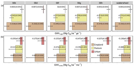 The growing season cooling effects (GWIΔαgs) ranged between −0.39 and −0.47 Mg Ceq ha−1 gs−1 for cropland, between −0.25 and −0.31 Mg Ceq ha−1 gs−1 for pasture, and between −0.01 and −0.11 Mg Ceq ha−1 gs−1 for urban. Urban was the only cover type that also showed warming effects, with GWIΔαgs raging between 0.01 and 0.05 Mg Ceq ha−1 gs−1. The inter-monthly variation of GWIΔαmo for cropland, pasture, and urban cover showed similar trends with higher cooling effects in January, February, and December (Tables S4.1–4.5 and Figure 4b). Among the three cover types, the highest cooling occurred in cropland (−0.18 to −2.15 Mg Ceq ha−1 mo−1), followed by pasture (−0.13 to −1.64 Mg Ceq ha−1 mo−1) and urban (−0.02 to −0.470 Mg Ceq ha−1 mo−1) cover. For the three cover types, GWIΔαmo was relatively constant from April to November. However, urban had slightly bell-shaped trends with small warming effects in June and July (0.01 to 0.1 Mg Ceq ha−1 mo−1; Tables S4.1–4.5 and Figure 4b), and cropland had an inverted bell-shaped trend with slight rises in June and October. Lastly, pasture (in Ecoregions 56b, 56f, and 56g) had relatively constant trends. The variation among ecoregions in GWIΔαgs was significant (p < 0.001) by ecoregion, cover type, and their interactions (ANOVA model in Equation (5); Table S(5)), while the variation in GWIΔαmo was significant (p < 0.001) only by cover type. Neither years nor months were significant for GWIΔα variations. Most of the variation in GWIΔαgs was explained by cover type (η2 = ~95%), followed by the interaction between ecoregions and cover type (η2 = ~52%) and ecoregions (η2 = 32%). In comparison, the variation in GWIΔαmo was almost equally explained by ecoregion, cover type, and their interactions, although only cover type was significant (η2 = ~24% at p < 0.001). The variation in both GWIΔαgs and GWIΔαmo within ecoregions (Equation (6); Table S(5)), however, was significant (p < 0.001) by cover type, which explained more of the variation in GWIΔαgs (η2 = 99%) than in GWIΔαmo (η2 = 65%).