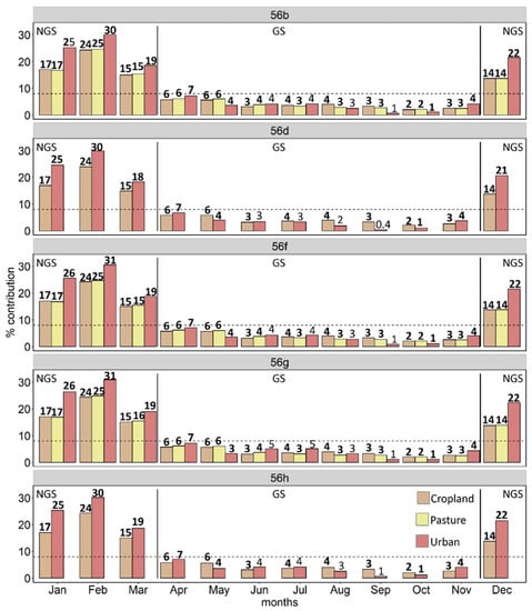 The overall GWIΔα contribution from different seasons and months varied by cover type, and it was exclusively higher during the non-growing season (NGS) than during the growing season (GS) months for all ecoregions (Table S6 and Figure 6), with the NGS months being characterized by only cooling effects (Table S7). As a general trend, the highest contributions were in February and the lowest in October. During the NGS, urban (at all ecoregions) contributed the most to the total cooling effect (between 18% and 31%), followed by pasture (at Ecoregions 56b, 56f, and 56g; contribution between 14% and 25%), and cropland (at all ecoregions; contribution between 14% and 24%). It is worth noting that during GS months, no cover type had a contribution >8% (i.e., 1/12 of the annual total). Nevertheless, climate regulations of urban (for all ecoregions) were close to the overall mean value of 8% in April, while cropland (at all ecoregions) and pasture (at Ecoregions 56b, 56f, and 56g) were close in April and May.