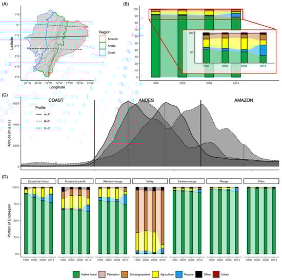(A)Three natural regions of continental Ecuador. (B) The major land cover types within the mapped extent of 64 forest ecosystems in 1990, 2000, 2008, and 2014. (C) Distribution of each ecoregion’s elevation. (D) The major land cover types by ecoregions (n = 7) based on imagery from four time periods (1990, 2000, 2008, and 2014). The legend of land use types in Figure 1B correspond to colors of land use types in Figure 1D.