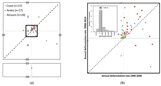 Scatter diagrams of forest ecosystems annual deforestation rate for the periods 1990–2000 and 2000–2014. (a) Changes in annual deforestation rate of single forest ecosystem (n = 64) for the periods 1990–2000 and 2000–2014 (a). Each point represents one forest ecosystem. Solid black outline is zoomed out (b). (b) Changes in annual deforestation rate of single forest ecosystem (n = 59), excluding extreme data (n = 5). (Inset) The distribution of the ecosystem’s differences in deforested area between 1990 and 2014. The vertical dotted line marks zero shifts, and the vertical solid line marks the median shift. The arrow describes the direction of the shift. This figure is based on the previous study Noh [64].
