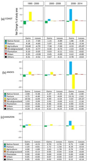 Net change, gains, and losses for each land cover class as a percentage of three regions: (a) Coast, (b) Andes, and (c) Amazon, for the periods 1990–2000, 2000–2008 and 2008–2014. This figure is based on the previous study Noh [64].
