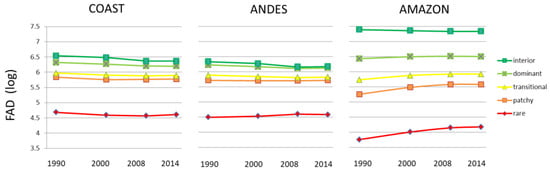 By 2014, continuous fragmentation became the dominant process, owing to a decline in the number of interiors, dominant FAD, and a slight increase in patchy and rare FAD in the Coast and Andes (Figure 4). In the Amazon, forest fragmentation was accompanied by the rapid increase in the number of patchy and rare FAD. Amount of interior FAD decreased following the introduction of these disturbed fragments into the matrix.