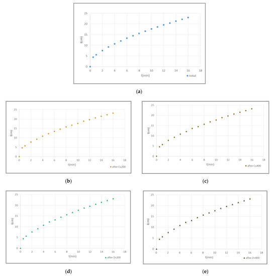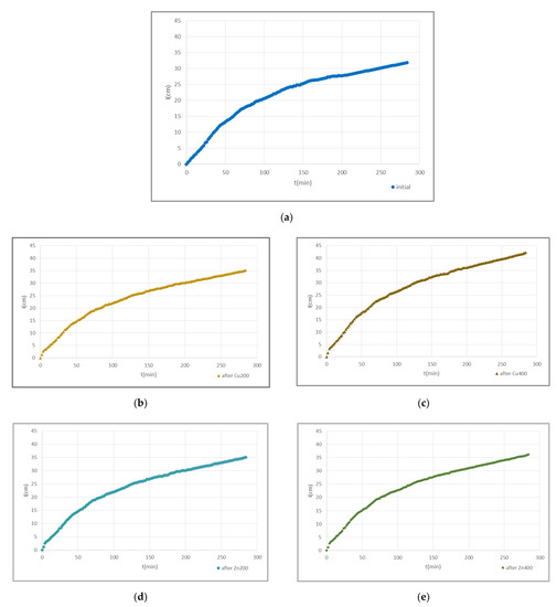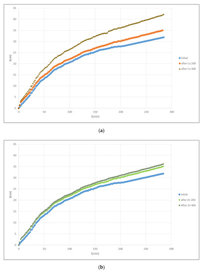 Figure 1 shows the cumulative infiltration I(t) curves for sandy soil (S) at 5 cases: (a) the initial curve (before contaminating the soil column with the Cu and Zn solutions) (b) after contaminating with Cu 200 mg·L−1 solution (Cu 200) (c) after contaminating with Cu 400 mg·L−1 solution (Cu 400) (d) after contaminating with Zn 200 mg·L−1 solution (Zn 200) and (e) after contaminating with Zn 400 mg·L−1 solution (Zn 400). In Figure 2, the cumulative infiltration versus time for loamy clay soil (LC) is shown, for the same 5 cases as above. Figure 3 illustrates collectively cumulative infiltration curves for loamy clay soil (LC), where (a) shows the initial (before contaminating the soil column with the Cu and Zn solutions), the after contamination with Cu 200 mg·L−1 solution (Cu 200) and after contamination with Cu 400 mg·L−1 solution (Cu 400) infiltration curve and (b) shows the initial (before contaminating the soil column with the Cu and Zn solutions), the after contamination with Zn 200 mg·L−1 solution (Zn 200) and the after contamination with Zn 400 mg·L−1 solution (Zn 400) cumulative infiltration curve.