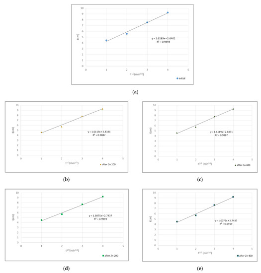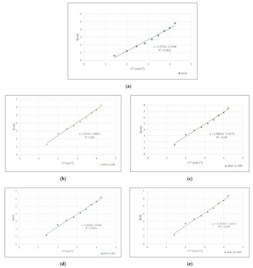 In Figure 4 and Figure 5 cumulative infiltration vs. square root of time for sandy (S) and loamy clay (LC) soil is shown respectively, for the 5 cases: (a) initial, (b) after Cu 200, (c) after Cu 400, (d) after Zn 200 and (e) after Zn 400 contamination of the soil samples. I(t1/2) functions show the relations between the infiltration (I) and the square root of time (t1/2) at the early times of the phenomenon, where the slope is equal to sorptivity of the soil (Equation (2)). At early times in the infiltration process, capillary forces are stronger than gravity [10]. Sorptivity (S) values for both soil samples and all cases are given in Table 4, where, in loamy clay soil, after doubling the concentration of copper in the incoming solution, a 20% increase in soil sorptivity was indicated. In addition, a 2.2% increase in sorptivity was mentioned in the case of Zn.