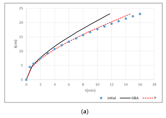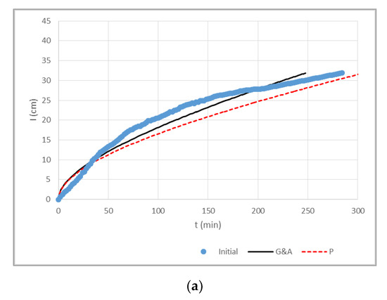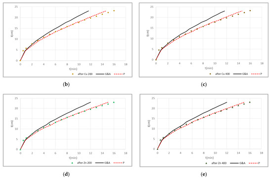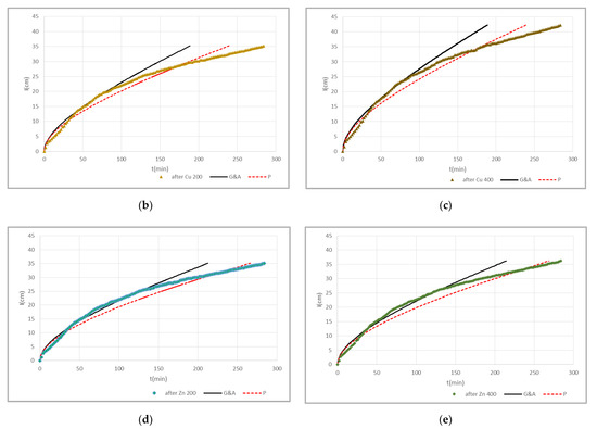 Figure 6 shows the approximation of cumulative infiltration experimental points of sandy soil (S) with G&A and P models, for the five cases: (a) initial (before contaminating the soil column with the Cu and Zn solutions) (b) after contaminating with Cu 200 mg·L−1 solution (Cu 200) (c) after contaminating with Cu 400 mg·L−1 solution (Cu 400) (d) after contaminating with Zn 200 mg·L−1 solution (Zn 200) and (e) after contaminating with Zn 400 mg·L−1 solution (Zn 400).