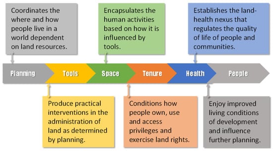 As shown in Figure 1, planning is the starting point of influence for development. It coordinates where and how people live in a world dependent on land resources. It leads to creating tools that produce practical interventions in land administration as determined by planning. Tools then shape space to encapsulate human activities based on how tools influence it. Space influences tenure (the condition concerning how people own, use and access privileges and exercise land rights). Tenure influences health (positively or negatively). It establishes the land–health nexus that regulates the quality of life of people and communities. Finally, enjoy all forms of improved living conditions or development options. Noteworthy is that people go on to influence further planning for their future. This relationship indicates that planning and people are critical factors in development. Land is the resource for development.