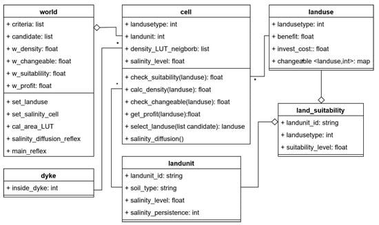 The diagram in Figure 2 shows the main objects in the model: the world, cells, land-use types, dike-protected regions, land units and the land-suitability dataset. The main objects are the cells. Each cell belongs to a land unit. The cells belong to the area inside or outside the dike. The land suitability of the cells is determined by the composition of land-use types and land units. The land unit provides information on soil type, salinity level and time of saline intrusion. Land units are associated with land-use patterns to provide a level of land suitability. Each cell also has a list of neighboring cells. Each land-use type provides the benefit and implementation costs, along with a map that measures how convenient it is to convert from one land use to another.