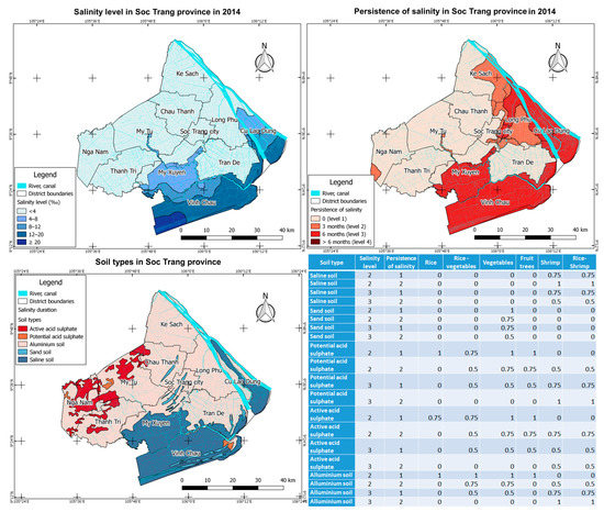 The input data of the model include land-use maps of Soc Trang province in 2005, 2010 and 2015. These maps were collected from the inventory maps created by the Department of Natural Resources and Environment of Soc Trang province in these years. Land-use maps were converted to raster format with 100 × 100 m resolution. The land-use map from 2005 was used to initialize cells, the one from 2010 was used to calibrate the model, and the land-use map from 2015 was used to verify the model. Moreover, the soil map of Soc Trang from 2014, salinity maps from 2005 and 2014 and projected salinity scenarios for 2030 were also collected (Figure 4). The salinity maps from 2005 and 2014 were used for Markov analysis to provide a Markov transition matrix for the salinity diffusion dynamic.