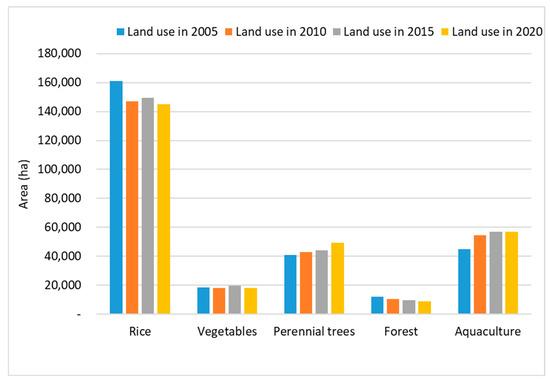 Land use in Soc Trang province in 2005–2020. (Source: Generated from statistical data [43,44,45,46]).
