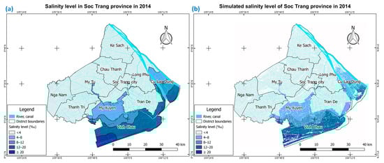 Salinity diffusion in Soc Trang province. (a) Salinity map in 2014; (b) Simulated salinity in 2014.