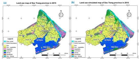 The map in Figure 7 shows a comparison between the simulated land-use map and the observed map of Soc Trang province in 2015. The obtained fuzzy kappa coefficient was 0.88. The simulated map showed that there was a big gap in the estuary area of the Long Phu district. This area was simulated as a rice–vegetable rotation, but in reality it was still a rice field. Nevertheless, the results also showed that the area of rice land decreased and the areas used for the production of vegetables and aquatic products both increased.