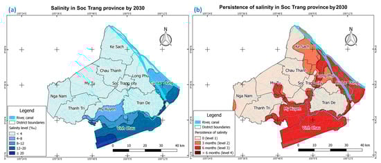 Saline instruction scenario. (a) Salinity map in 2030; (b) Persistence of salinity in 2030. (Source: Generated from DRAGON Institute, 2016 [41]).