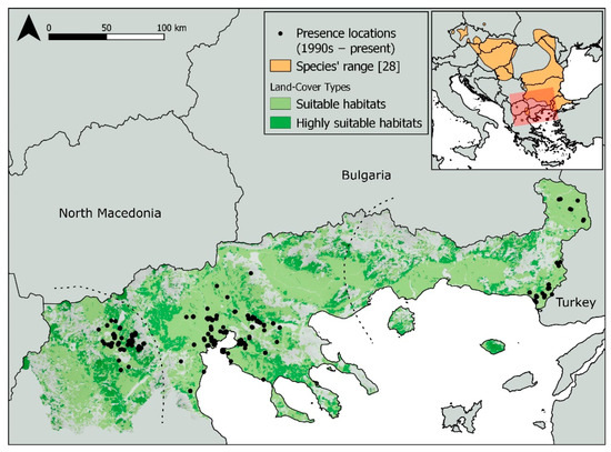 The distribution of the presence records (1990−2021) of Spermophilus citellus in Northern Greece. The suitable habitats of the species in the study area are schematically marked in green (light green for suitable and dark green for highly suitable habitats, please see Table 1 for more details), and the unsuitable habitats are in grey. Habitat suitability was assessed based on ecological criteria from [17,19]. Dashed lines separate the three sub-populations of Western Macedonia (left), Central Macedonia (center), and Thrace (right).