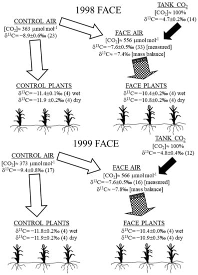 Our first objective was to collect air, plant, and soil samples over the course of the 1998 and 1999 sorghum FACE experiments to characterize the state of their stable-carbon isotope system. Our second objective was to use the isotopic values, especially temporal shifts in soil carbon isotope values, to calculate the isotope mass balance fraction of SOC resulting from the excess “new” carbon added to soils under the elevated [CO2Air] treatments relative to that added to the SOC in the control.