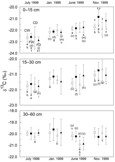 The δ13C values of the SOC for all treatments and 3 depth intervals are presented in Figure 2. The baseline isotopic values at the beginning of the FACE experiments (July 1998) are indicative of homogeneity within each depth interval across the field over the positions of all experimental plots, similar to that demonstrated following the field treatment (disking, plowing, and leveling) just prior to the 1995–1996 Maricopa FACE wheat experiments [46]. The isotopic composition in July 1998 shows a trend of progressive 13C enrichment of ca. 2‰ with depth in all plot positions from the surface layer down to 30–60 cm. This follows the isotopic pattern at a depth seen in prior FACE cotton and wheat experiments in the adjacent agricultural field to the south [8,9,10]. The pattern is consistent with the deep-layer composition that is more concordant with carbon from native vegetation comprising primarily plants utilizing CAM and C4 carbon fixation pathways, whereas surface layers were more 13C depleted because of the frequent cultivation of C3 plants (e.g., cotton and wheat) over several prior decades. The deep 30–60 cm soil layer showed greater δ13C stability over the 2-year experiment, compared to the upper two soil intervals that exhibited an increasing trend in δ13C. This shift is seen over all treatments, with evidence of the shift even after the first experimental season, suggesting rapid entry of 13C-enriched sorghum organic matter into the SOC pools represented in our pretreatment methods.
