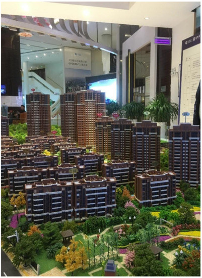 Whereas 3D modeling is frequently applied in the architecture and landscape design of neighborhood construction, the predominant sales methods are still in 2D. The traditional sales office provides tools, including a 3D sandbox (Figure 2), floorplan, model room, and display area. The term 3D sandbox refers to a scaled-down model of the actual neighborhood development. Buyers can see a simulation of the whole neighborhood and the surrounding environment. The floorplan is a scaled-down map showing the relationship between rooms, spaces, and other physical features inside one property from a horizontal top view. The model room shows a furbished property example. The display area includes both a model room and landscape elements (e.g., grass, trees, and art installations). Virtual reality (VR) may be the most popular 3D application reported by real estate sales managers, and it has been utilized for landscape presentations in the first-tier cities (e.g., Shanghai and Beijing), but not yet in Xi’an. This is likely due to (1) the inherent time-consuming and labor-intensive nature of VR, which adds an unnecessary cost in a robust property market like Xi’an, and (2) customer feedback. Buyers are apt to believe what they see in reality rather than virtual models. The model room and display area are considered enough of a representation.