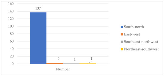 Out of 141 valid responses, only four choose options that are not of south–north orientation (Figure 4). Twelve respondents explained their reasons, and these respondents all choose the south–north orientation; seven mentioned good daylight, two aimed to avoid too much sunlight exposure, and four voted for ventilation. The results are consistent with the facts obtained in the interviews, confirming that most residents prefer the south–north orientation, which facilitates ventilation, cools down the room temperature in summers, and extends daylight hours. Only two respondents chose southwest–northwest and southeast–northeast. Deflection angles are not appreciated in housing selections within the Chinese culture. The due orientations (e.g., due north and due south) are more popular, which may be why almost all high-rise neighborhoods in the property market only have due orientations.