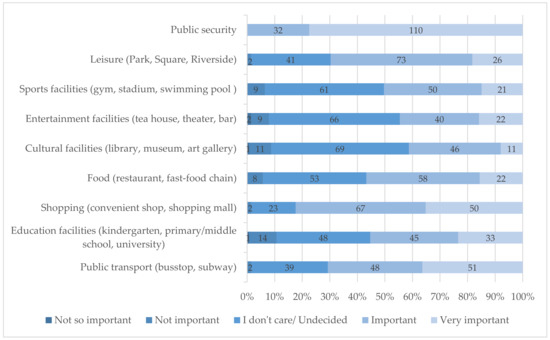 Figure 5 and Figure 6 provide a detailed breakdown of buyers’ preferences in respect of environmental and locational 2D and 3D factors, respectively. Regarding the 2D aspect, all respondents chose very important and important for public security, attaching significant importance to personal safety. Shopping and public transport were the following two top choices, with the supporting rate (the total of very important and important responses) of 82.4% and 70.7%, respectively. In the 18–27 and 28–37 age cohorts, the rates were even higher, with 83.7% and 75.3%, respectively. This reflects that younger adults have more significant demands for shopping and public transport than other age cohorts. In addition, 69.7% of respondents regarded leisure as important and very important, 28.9% opted for undecided/I don’t care while only two respondents thought it not important. Educational facilities were most popular among cohorts aged 28–37 and 38–47, with the supporting rate of 60.0% and 72.0%, respectively. A plausible reason for this is that they have higher possibilities of having young offspring than any other age cohort. As a result, neighborhoods with access to premium educational resources are highly valued. It is understandable that 53.3% of 18–27 years old are not concerned because they do not have to worry about children’s education. By the same token, 68.9% of the 18–27 age cohort considered it important and very important to have easy access to food, while the rate dropped to only 50.0% in the cohort aged over 55. Only 6.4% of respondents voted either not important or undecided/I don’t care in relation to sporting facilities. The cohort aged 38–47 valued sporting facilities most highly, with a supporting rate of 76.0; they valued physical health, and sports expenditure should be affordable. Entertainment facilities and cultural facilities were the two least important factors, with supporting rates lower than 50.0%. These two factors are also among the three factors which respondents selected as being not at all important. Of the respondents, 47.5% did not care at all about entertainment facilities, and 6.5% thought they are not important. For cultural facilities, only 41.3% had positive responses, and nearly half were not concerned. In summary, different age cohorts have different preferences in terms of locational factors.