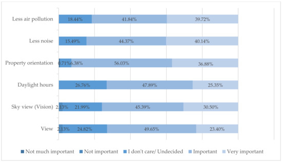 As for buyers’ preferences, first, 3D factors receive an overall higher score (1.12) than 2D factors (0.88), which means that buyers highly value 3D factors in housing selections. The importance of 3D factors is also reflected in the appreciation for living in middle and high story levels (83%); great views and a broad field of vision cannot be enjoyed at lower story levels. This is in line with findings in the existing literature which reports that view, visibility, and sunshine duration change with building height [45,46,47,48]. Second, apart from public security receiving the highest score, and consistent with common-sense intuition and Wu [23] as well, 3D factors are rated at the very top. This fact indicates that buyers value 3D factors to a significant degree. Noise levels are related to different story levels, and buildings close to roads are exposed to a higher noise level [47,48,49,50]. Air pollution also correlates with 3D; the pollutant concentration decreases as the building height increases [51,52]. This also has a close link with noise because high traffic flows are likely to cause low air quality [53].