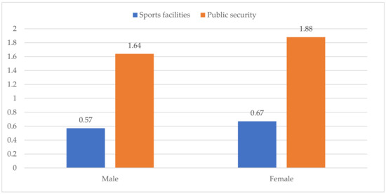 Regarding gender, two factors present with statistically significant differences, namely, sports facilities and public security, which are both 2D factors (Figure 7). Regarding sports facilities, the mean value for males and females is 0.57 and 0.67, respectively, which indicates females attach greater importance to sports facilities in their housing preferences than males. Similarly, public security had a mean value of 1.88 in females, whilst in males, the mean value was 1.64. Regarding 3D factors, no statistically significant difference is detected in terms of gender preferences.
