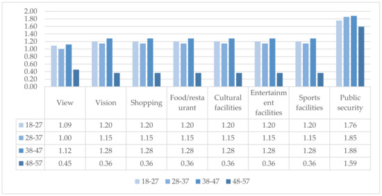 Regarding age groups, view, vision, shopping, food/restaurant, cultural facilities, entertainment facilities, sports facilities, and public security—two 3D and six 2D factors, were observed, with a statistically significant difference among different age groups (Figure 8). Generally, the mean value of the age group 48–57 is considerably lower than the other three groups, whilst the other three groups have similar mean values. No significant differences between 2D and 3D factors were observed. These facts reveal that the elderly group cares less about the surrounding environment and infrastructure.