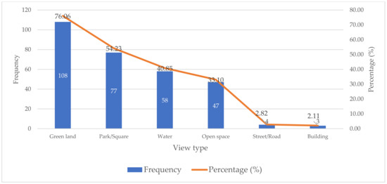 Figure 9 shows the preferences for different view types. The majority did not prefer street/road (2.82%) and building (2.11%) views, and only 7 choose these two options. The other four view types were relatively popular. Ranked first, was a view of green land, for which 76.1% voted in favor. The second highest is views of parks and squares (54.2%). Green space positively impacts the environment, such as noise reduction and an improvement in air quality; parks and squares are always combined with delightful landscape designs. Additionally, being able to see a park means proximity to enjoy the convenience. In terms of views of the water and open spaces, 40.9% and 33.1%, respectively, found these favorable. This may be because water and open spaces have two sides. Apart from their aesthetic value, water quality may worsen and even become polluted without proper management, thereby negatively influencing the living environment. In addition, open spaces may become enclaves for sub-cultural groups without governance or high-rise buildings, which residents tend not to appreciate.