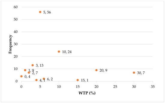 An overview of WTP for preferred property orientation. The x-axis represents the WTP (%), and the y-axis represents the number of responses (e.g., 5, 56 means 56 respondents are willing to pay 5% extra).