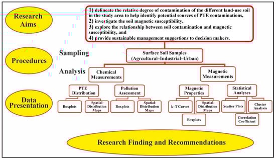 In Egypt, like in most developing African countries, environmental management legislation often lags behind uncontrolled human activity. Continuous urbanization and industrial development of the Nile Delta region have caused a considerable increase in PTE contamination of the limited fertile soil, creating a potential health risk of vast proportions [6,38]. To alleviate the stress on limited soil resources, considerable Egyptian efforts have been made in the field of improvement of soil fertility [39] and soil remediation [40,41,42]. There are few studies in Egypt using magnetic and chemical analysis techniques as parameters for assessment of soil contamination [43,44]. Therefore, the aims of the present study are to: (1) delineate the relative degree of contamination of different land-use soil in the study area to help identify potential sources of PTE contaminations; (2) investigate the soil magnetic susceptibility; (3) explore the relationship between soil contamination and magnetic susceptibility, and; (4) provide sustainable management suggestions to decision makers.