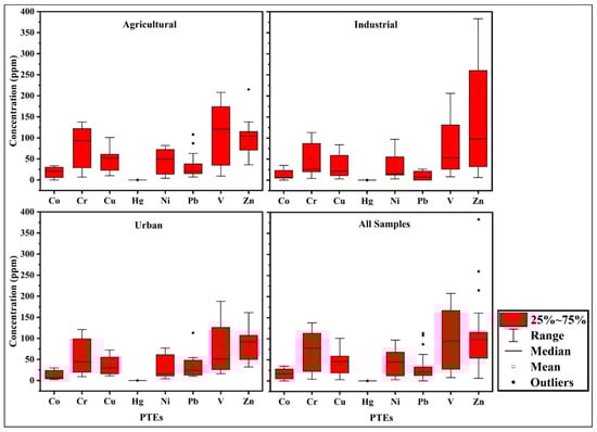 The concentrations and descriptive statistical parameters (minimum, maximum, mean, and standard deviation) of the measured PTEs and some major elements (Al, Fe, and Mn) in the analyzed samples are summarized in Table 1. V and Zn were recorded in the highest concentrations, and at the same time Hg had the lowest concentrations in all land-use soil samples. In general, the concentrations of Co, Cr, Cu, Hg, Ni, Pb, V, and Zn ranged from 0.0 to 35, 4–138, 3–101, 0.0–0.19, 3–97, 0–113, 8–208, and 6–899 ppm, respectively. The mean concentrations of these PTEs followed the order V > Zn > Cr > Cu > Ni > Pb > Co > Hg, Zn > V > Cr > Cu > Ni > Co > Pb > Hg, and Zn > V > Cr > Cu > Ni > Pb > Co > Hg in agricultural, industrial, and urban soil, respectively (Table 1 and Figure 3).