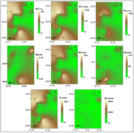 Spatial distribution maps presented in Figure 4 provide a comprehensive illustration of the concerned PTE distribution over the study area. These maps clearly indicate that the PTEs’ intensive concentrations are recorded around or near industrial zones (Figure 1). These results obviously indicate an influence of anthropogenic activities on PTEs (Co, Cr, Cu, Ni, Pb, V, and Zn) contamination in the study area. Such influence is most likely associated with industrial activities, intensive urbanization, and agricultural activity. The Co, Cr, Ni, Pb, and Zn enhanced concentrations in soil may be mainly derived from traffic congestion, fuel consumption, and coal combustion [8,13,15,67,68]. Equally, soil can be contaminated with Co, Cr, Cu, Ni, Pb, V, and Zn from industrial activity via atmospheric deposition [3,4,6,8,20,68]. Agricultural soils can be contaminated with Co, Cr, Cu, Ni, Pb, and Zn through misuse of pesticide (herbicides, insecticides, and fungicides), intensive surface application and spraying of chemical fertilizer, organic manure, the reuse of agricultural drainage water, discharging of industrial effluents into irrigation waterways, and reuse of treated wastewater [11,19,51,65,68,69,70,71].