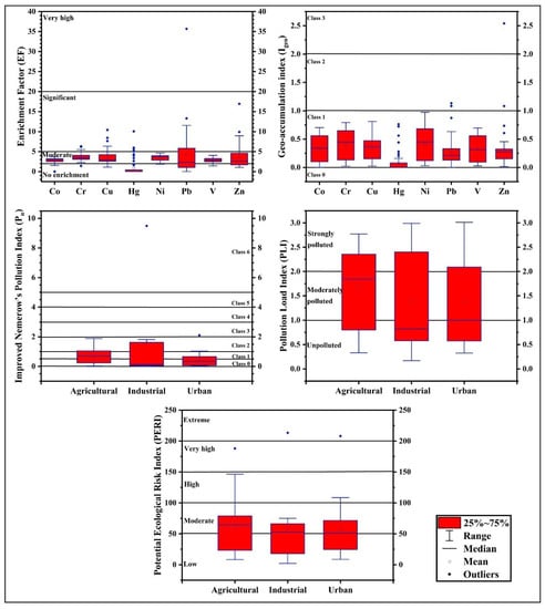 However, the EF and Igeo are considered as single-element contamination indices and fail to accurately reflect the comprehensive contamination for all PTEs of each sampling site. In this regard, integrated multi-element contamination indices such as Pn, PLI, and PERI were required in order to adequately evaluate the PTEs-contamination level over the investigated area [51,60,72].