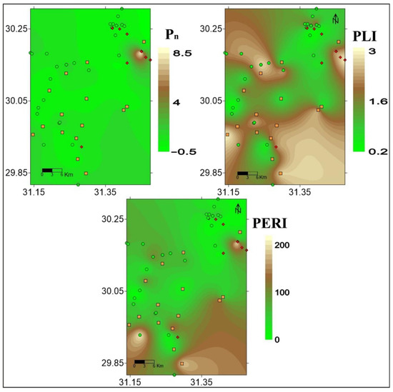 The spatial distributions maps of Pn, PLI, and PERI in Greater Cairo soil samples are shown in Figure 6. These maps are of profound importance, providing decision makers a certain identification of riskier areas.
