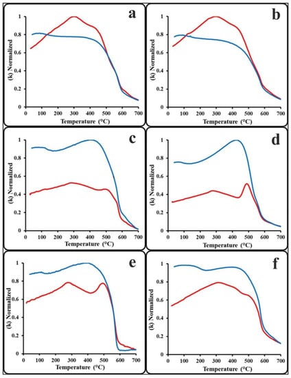 Magnetic susceptibility of soils is due almost solely to Fe (and Ti-substituted) oxides. Investigated soil samples exhibited clear differences regarding the concentration of magnetic carriers between the different land-use soil. Agriculture soil samples were characterized by fairly reversible heating and cooling curves during thermomagnetic susceptibility (k–T) cycles indicating titanomagnetite (Fe2+(Fe3+,Ti)2O4) as the main carrier of magnetization in these soils (Figure 7a,b). The thermomagnetic susceptibility curves of these soil samples showed three Tc of 350 °C, 580 °C, and 680 °C, indicating that titanomagnetite, magnetite (Fe3O4), and hematite (α-Fe2O3) dominate their magnetic properties. On the other hand, industrial and urban soil samples were characterized by strong reversible heating and cooling cycles (k–T curves) (Figure 7c–f) typical for multi-domain (MD) magnetite, which, despite the masking effect of newly formed magnetite, confirms the existence of magnetite in the original samples.