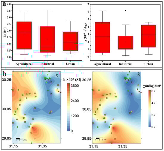 The bulk magnetic susceptibility values (k) range between 0.15 and 3.56 × 10−3, 0.21–3.42 × 10−3, and 0.15–3.56 × 10−3 for agricultural, industrial, and urban soil samples, respectively. Likewise, the mass-specific magnetic susceptibility (χ) ranges between 0.17 and 6.18 × 10−6, 0.24–6.12 × 10−6, and 0.17–6.18 × 10−6 m3/kg for agricultural, industrial, and urban soil samples, respectively (Table 3; Figure 8a). The measured magnetic susceptibility values indicate magnetically enhanced soil signals. k and χ show nearly the same distribution over Greater Cairo (Figure 8b).