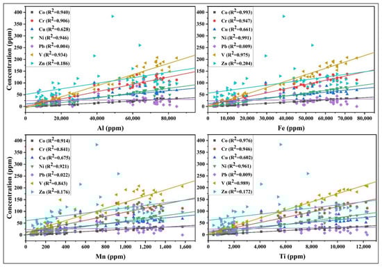 Scatter plot of PTEs with Al, Fe, Mn, and Ti.