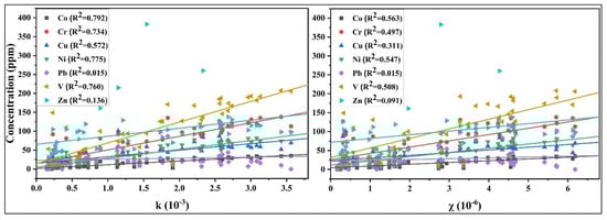 Figure 10 represents the scatter plots between magnetic susceptibility values (k and χ) and the PTEs. Co, Cr Cu, Ni, and V showed significant positive linear relationships with magnetic susceptibility values. Interestingly, the observed positive relations of these PTEs with k were more significant than those of χ.