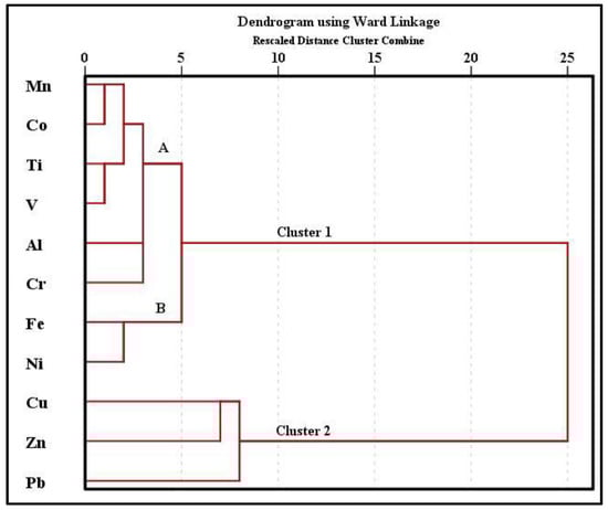 The output of HCA is a dendrogram connecting variables with a significant degree of similarities. The results of HCA (Figure 11) show that there are two main distinctive clusters among the considered variables. Cluster (1) splits into two subclusters: A (Mn, Co, Ti, V, Al, and Cr) and B (Fe and Ni). This confirms the significant role played by major ions in the distribution of Co, Cr, Ni, and V. The confirmed association between Co, Cr, Ni, and V suggests these elements have mixed anthropogenic sources of industrial, agriculture, and transportation. Cluster (2) is related to Cu, Zn, and Pb, which are frequently associated elements and are normally detected in industrial effluents [60], suggesting these elements have multiple anthropogenic/lithogenic sources in the studied soil.