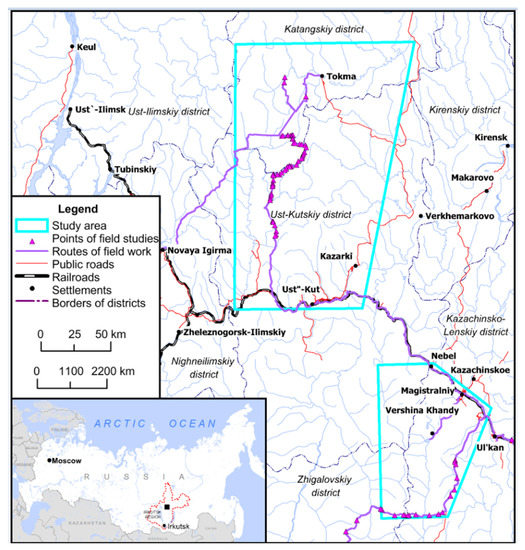 The Tokma study area (2107 thousand hectares) includes the Evenki village of Tokma and the Yaraktinskoie and Ichodinskoie oil fields. Infrastructure development is conditioned by the expansion of oil and forest industries in addition to geological explorations. It includes the area allocated for traditional land use of an Evenki obshchina (community hunting enterprise) “Tokma” with 20 members from the village (total 1115 thousand hectares). The Khanda study area (696.5 thousand hectares) is centered around the Evenki village of Vershina Khandy and includes the town of Magistralny and the area of the Kovyktinskoie gas field. The village has no official road connection (distance to Magistralny about 36 km). The Kovyktinskoie gas condensate deposit was discovered by geologists in 1987 and is known as the biggest gas deposit in the Russian East [40]. By 2022 it is expected to become the main source for the Power of Siberia gas pipeline. Forestry and geological exploration companies are also active in the area. The Khanda site includes the area of traditional land use of an Evenki obshchina “Khandinskaia” with 71 members (299.1 thousand hectares).