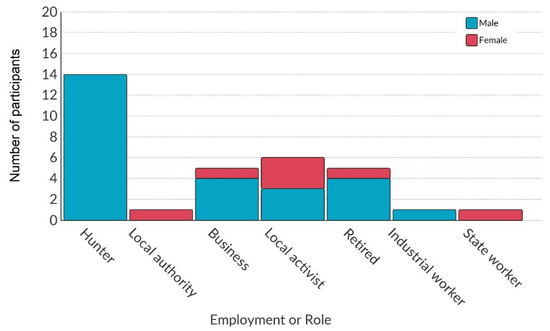 All interviews were transcribed. The data were coded and analysed in order to identify persistent topics using NVivo software. Based on the analysis, we extracted the topics of fire and permafrost, examined the contexts in which these topics were mentioned, and investigated when and how the topics intersected. Wildfires were mentioned in 33 interviews. In the same pool there were 12 interviewees who mentioned permafrost. Among the interviewees, fires were the most discussed topic among male hunters and experts, including representatives of local authorities, a forestry company, an oil company, and a former representative of forestry management. The male bias (26/7) is a result of the fact that most observations were provided by hunters and forestry workers, predominantly male occupations (Figure 2).