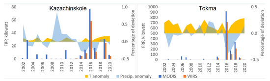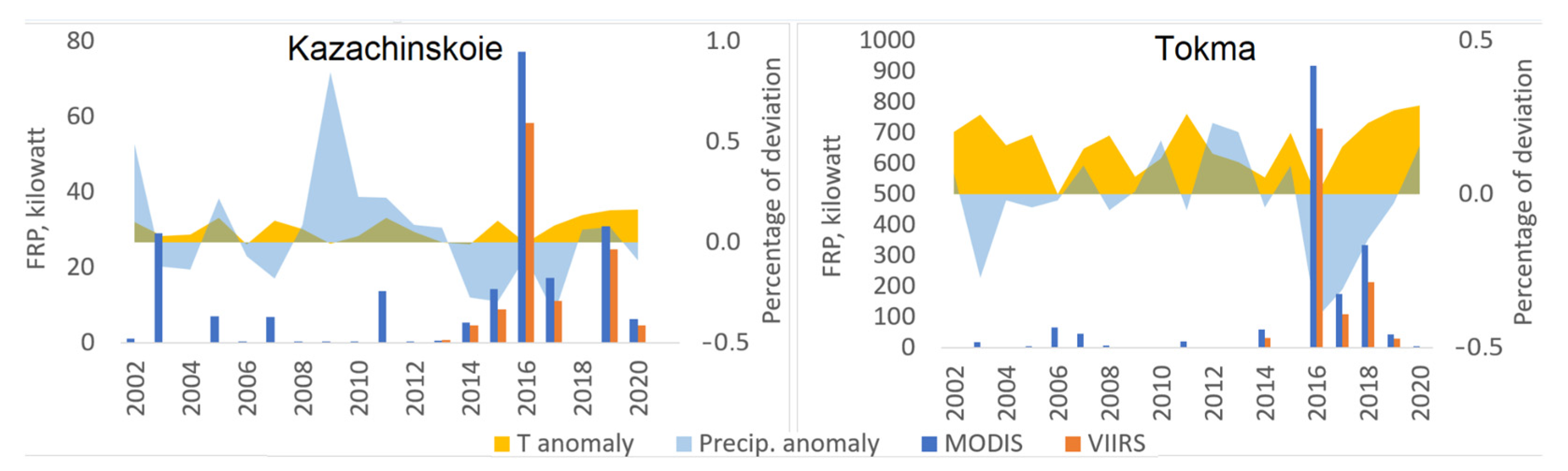 During the last decade, wildfires in the study region were very intensive (Figure 3). For example, in multiple years between 2014 and 2019 the annual cumulative FRP exceeded the combined intensity observed for all previous years. A comparison of temperature and precipitation anomalies during the warm period of the year (May–October) at Tokma and Kazachinskoie weather stations with satellite FRP data revealed a number of important patterns. For the Tokma area, both MODIS and VIIRS sensors detected significant FRP increases during dry years independent of the air temperature changes. In contrast, in the Khanda area the intensity of fires increased concomitantly with air temperature, although a coincidence with depressed precipitation was also observed.