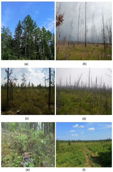 Examples of taiga landscapes: (a) coniferous forest; (b) forest burned in 2019; (c) tundra or mar’ (swampy forest); (d) swampy forest burnt in 2018; (e) navolok; (f) kaltus.