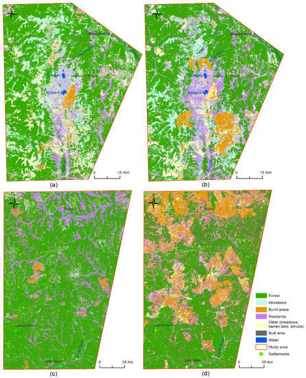 Types of land cover in the study areas: (a)—Khanda area, 2014; (b)—Khanda area, 2019; (c)—Tokma area, 2014; (d)—Tokma area, 2019.