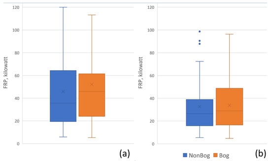 Boxplot with average annual FRP values in peatlands and other areas: (a)—Tokma area; (b)—Khanda area.