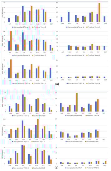 The analysis of seasonal wildfire dynamics using satellite data showed that the intensities of combustion in peatlands and in forest are comparable throughout the year according to two different sensors (Figure 7). MODIS Aqua night-time values were generally higher for peatlands than for other areas in both study sites. In addition, according to MODIS daytime data for the Tokma area, peatland fires demonstrated higher FRP values than those in other landscapes. There was a higher intensity of fires in the beginning of the summer in forest landscapes than in bogs, with higher values of FRP in April than in May. In some cases, we see that forest fires are rarely detected in fall, while in swamps they still exist (e.g., Aqua night data in the Khanda area and VIIRS night data in the Tokma area). In October, thermal anomalies in peatlands were not recorded. The differences in FRP values observed by different satellites are related to both their instrument characteristics and landscape features. In particular, higher values of daytime data are related to the duration of daylight hours. VIIRS has lower absolute values (this can be caused both by the sensitivity of the sensor and by calibration features [56,57]), while MODIS Aqua and Terra satellites have comparable data both in dynamics and in average.