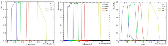 Figure 2. The spectral response function of the sensor ((ac) are the spectral responses of Sentinel-2, Landsat 8, and HJ respectively).