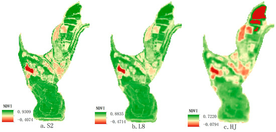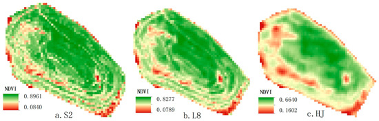 Figure 5. NDVI monitored by different satellite sensors in the West Dump ((a): NDVI caculated from Sentinel-2(S2); (b): NDVI caculated from Landsat 8(L8); (c) NDVI caculated from HJ).