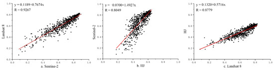Figure 6. Correlation analysis of NDVI value based on random points (The figures include the conversion equation and correlation coefficient between every pair of sensors for NDVI. (a) shows the fitting result of NDVI between Landsat 8 and Sentinel-2; (b) shows the fitting result of NDVI between Sentinel-2 and HJ; (c) shows the fitting result of NDVI between HJ and Sentinel-8).