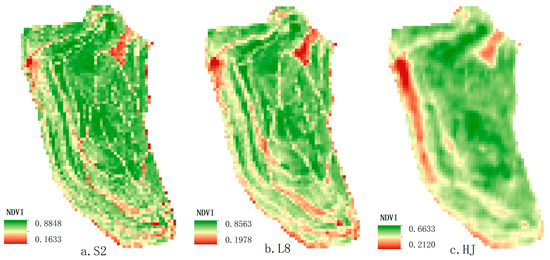 From the mean of NDVI, the monitoring values of Landsat 8 and Sentinel-2 sensors are similar for every vegetation cover type, while the values under HJ monitoring are relatively lower. Additionally, from the point of view of NDVI value, NDVI monitored by the HJ is generally in the middle range. That is, compared with Landsat 8 and Sentinel-2 satellites sensors, NDVI values under HJ monitoring show a phenomenon in which the low values are higher and the high values are lower.