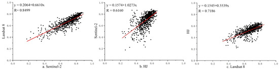 In order to compare the correlation between sensor monitoring results under different types of vegetation cover (Table 1), NDVI monitored by HJ, Sentinel-2, and Landsat 8 were obtained separately. Based on the NDVI results, the correlations under different vegetation cover were obtained by unary linear regression analysis.